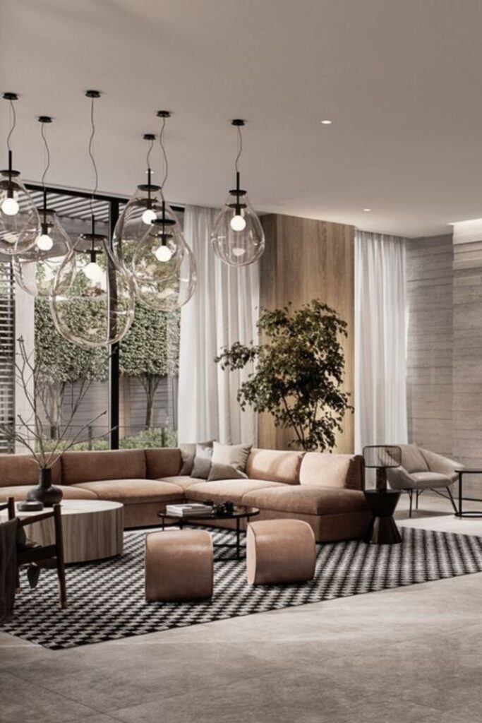 Pense em uma sala com sofá cinza-claro, mesa de vidro, luminária fina preta e poucas decorações. Tudo clean, moderno, organizado.